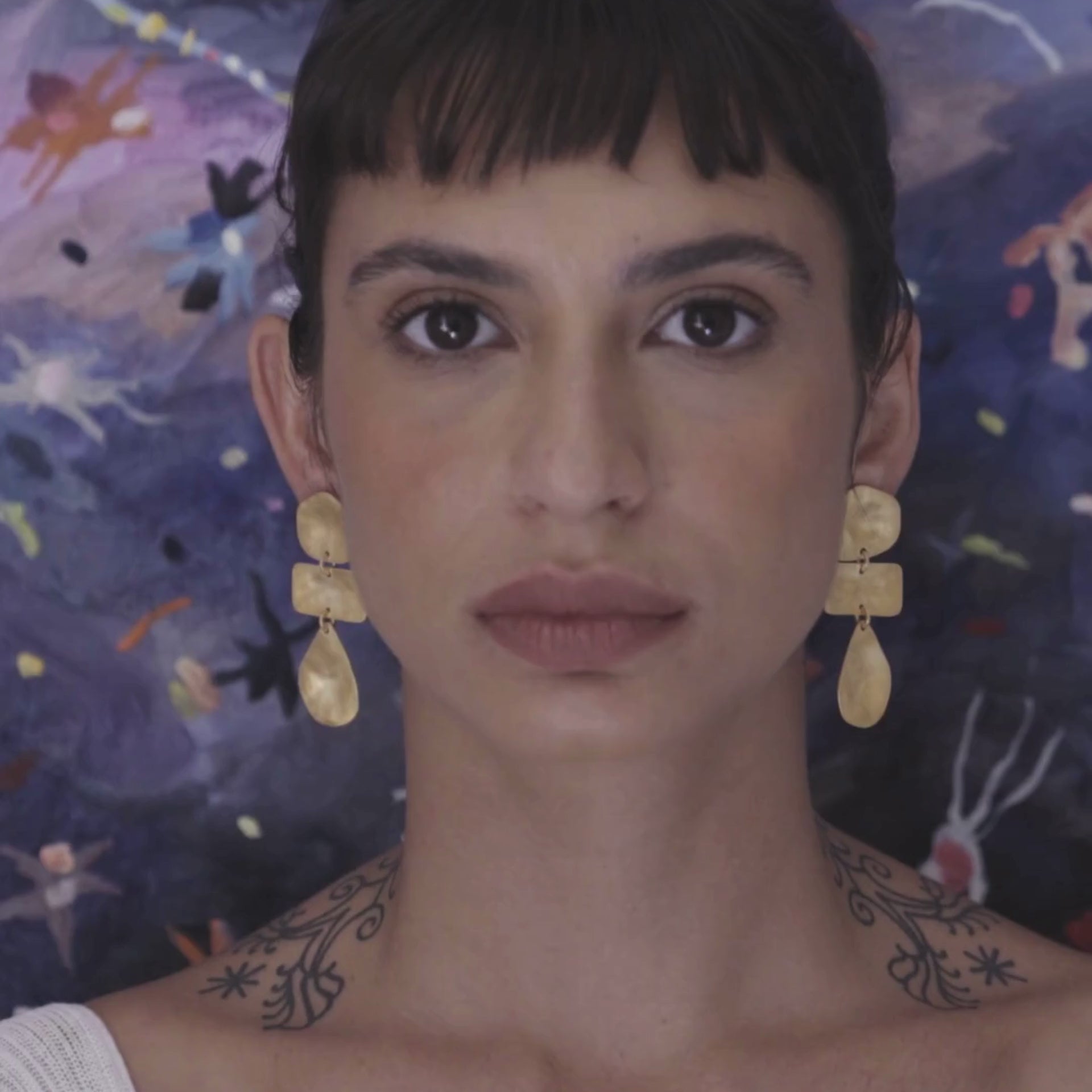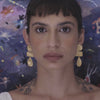 Feito em liga metálica com banho de ouro 18k, o brinco cria um jogo de movimento e leveza ao acompanhar o contorno do rosto. Suas formas sobrepostas refletem a luz de maneira sutil, revelando texturas únicas a cada ângulo.