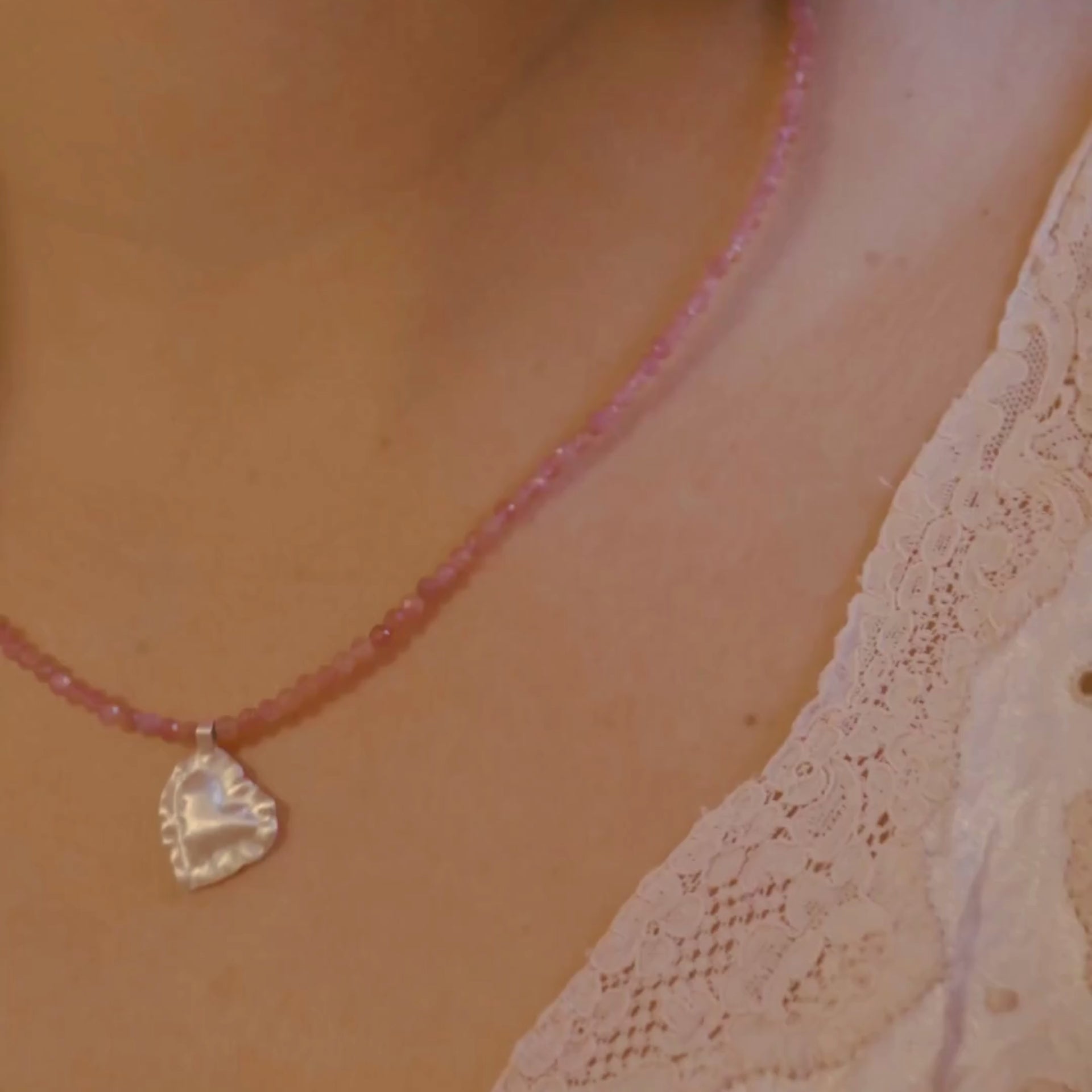 O Colar Poema é composto por delicadas pedrinhas de turmalina rosa e um pingente de coração em prata 950. Joia especial e delicada.